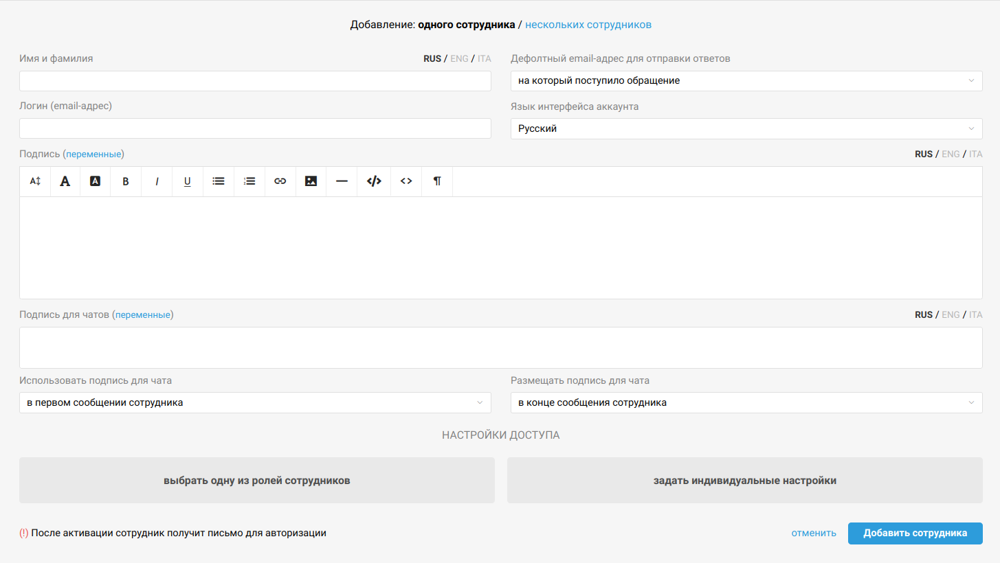 Обязательно нужно указать только имя сотрудника, имейл, который будет использоваться как логин для входа в аккаунт, а также выбрать уровень доступа.