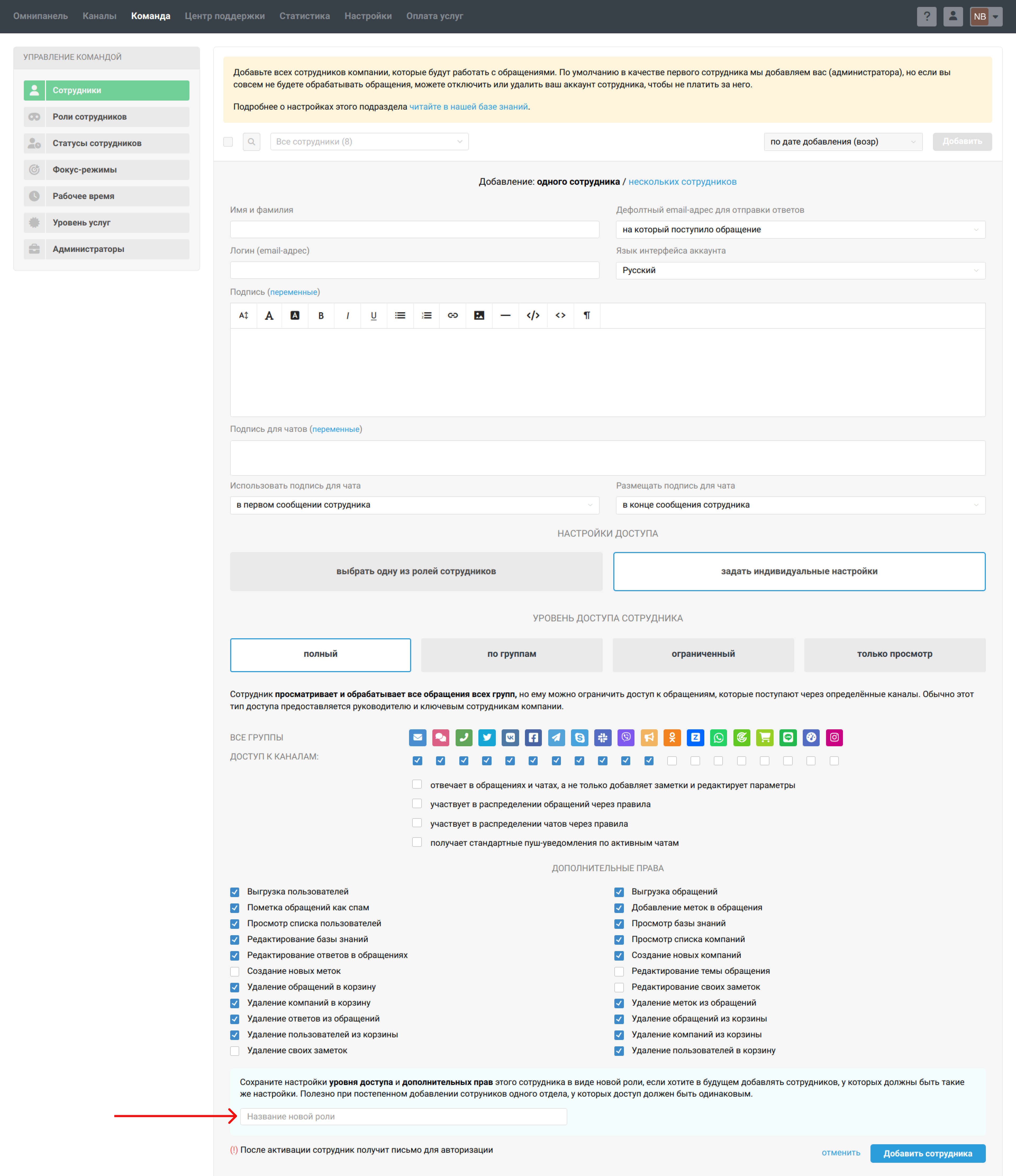 Роли — заранее определенные наборы настроек подписи, доступа и дополнительных прав. Можете один раз задать нужные настройки, например, для разных отделов компании или линий поддержки, и затем просто указывать подходящую роль при изменениях внутри команды или при добавлении новичка.