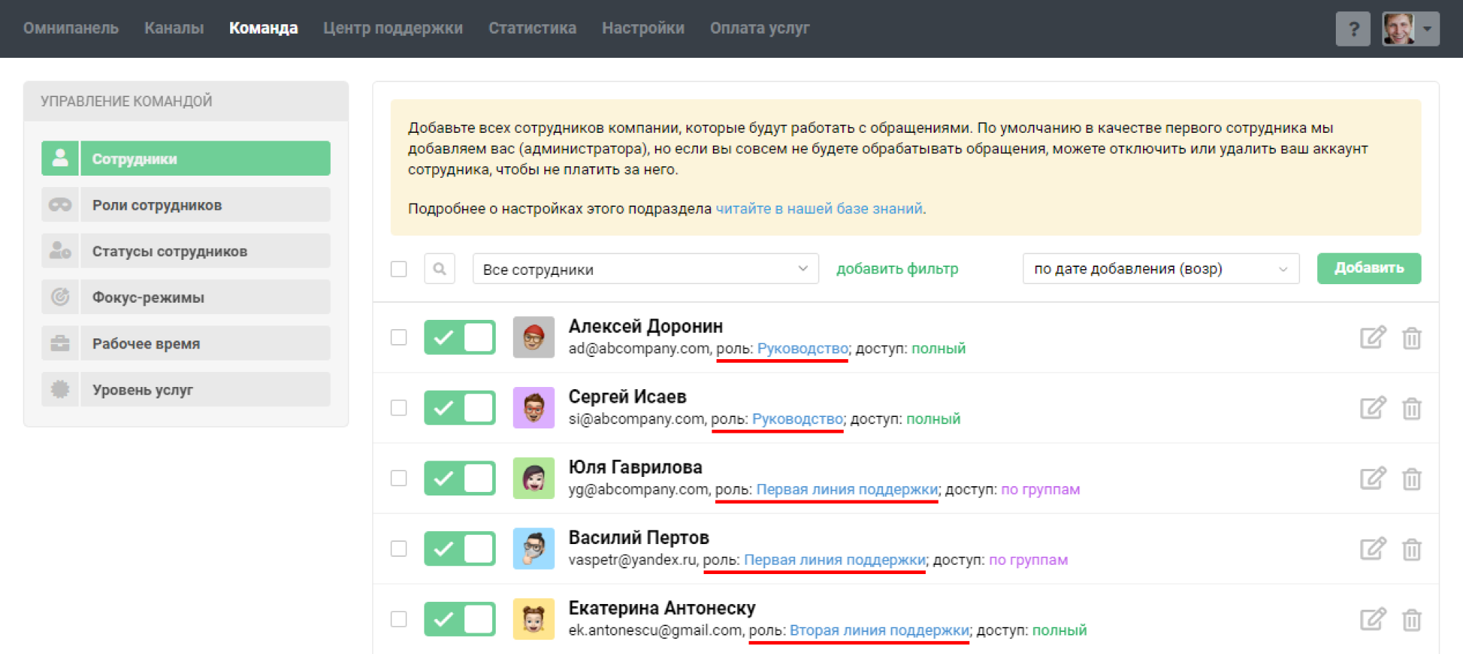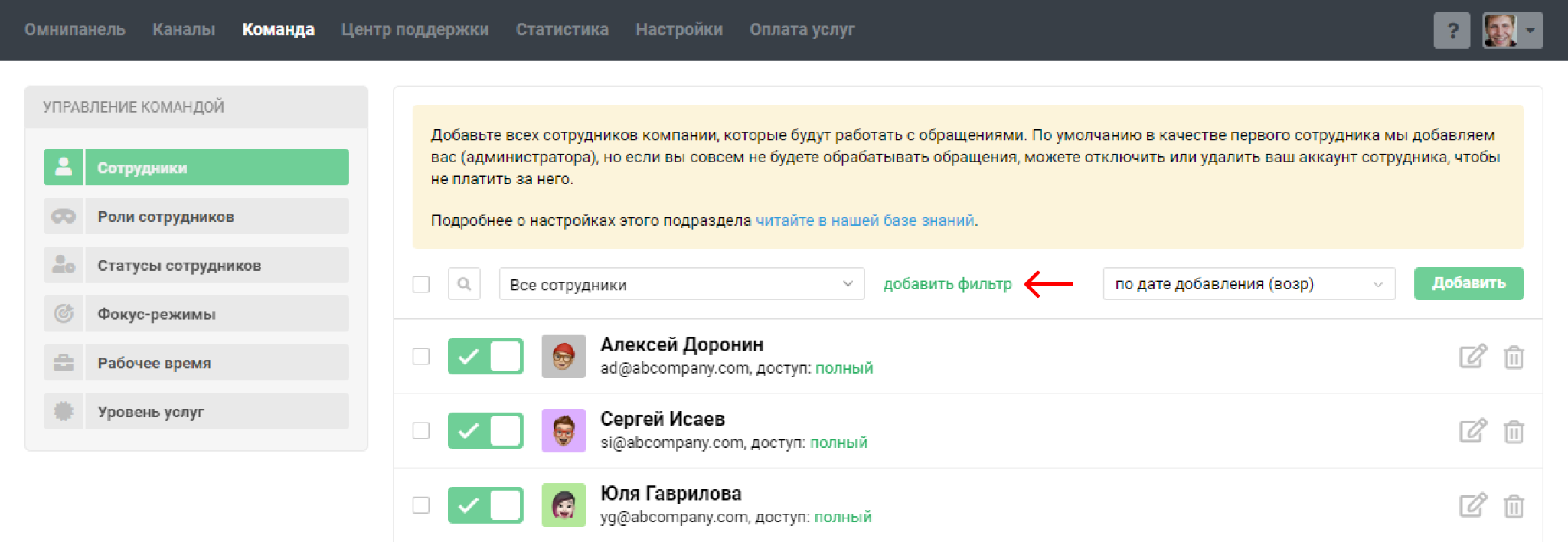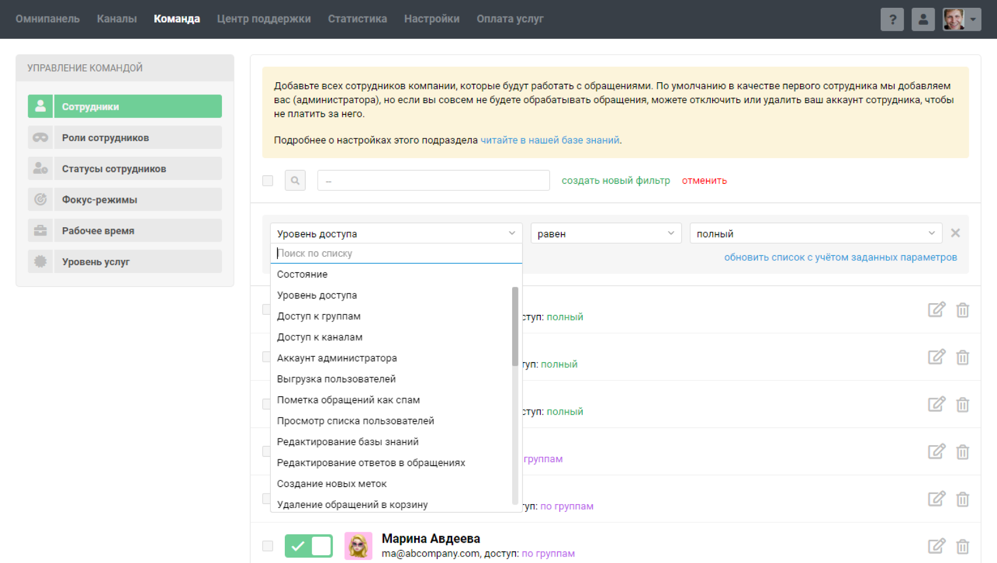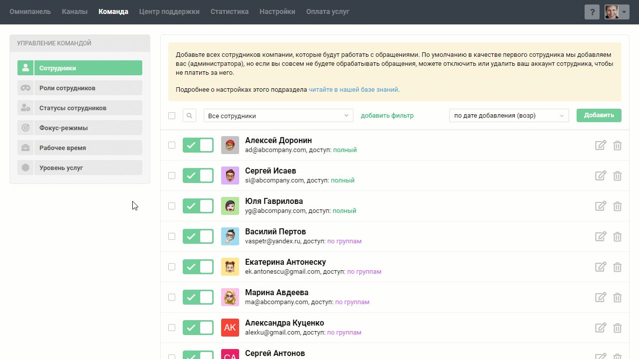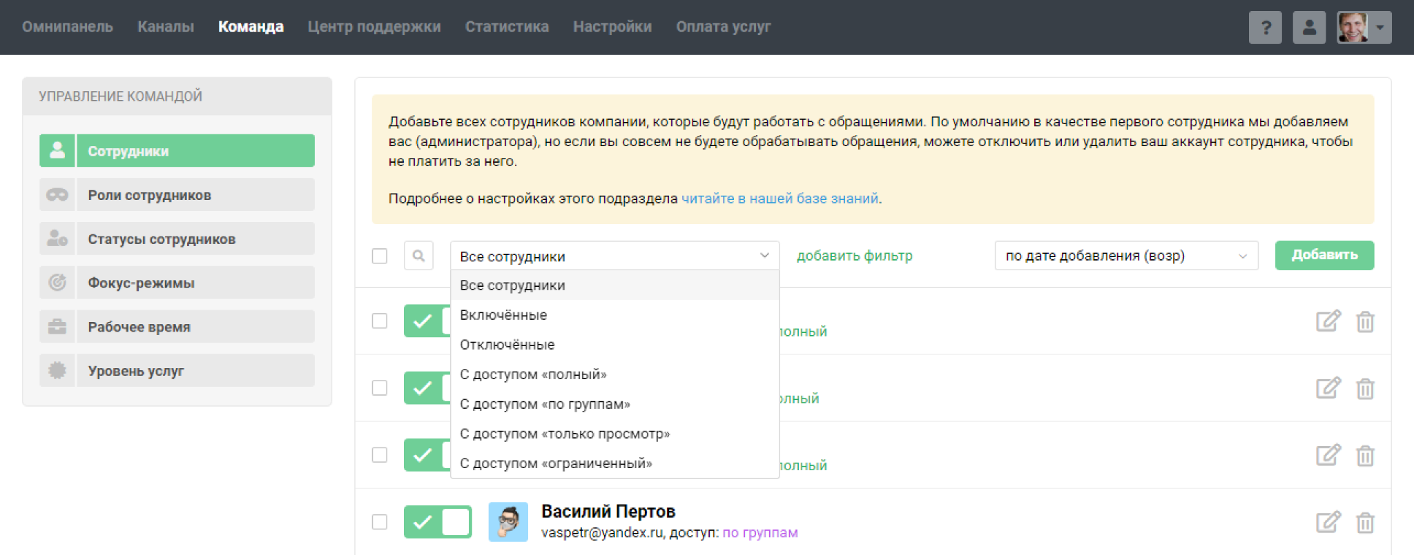 Подраздел «Сотрудники» в разделе «Команда» позволяет добавлять сотрудников и гибко настраивать их права доступа. Рассмотрим основные возможности: