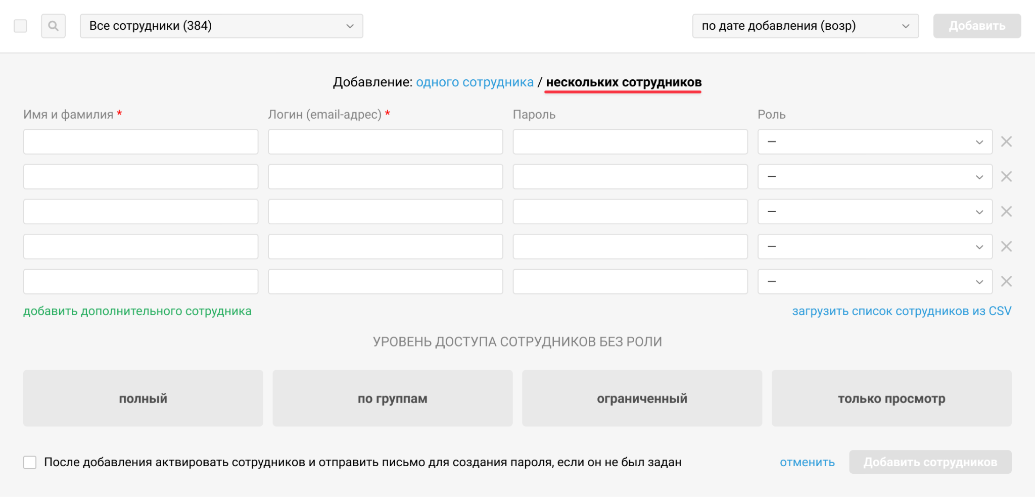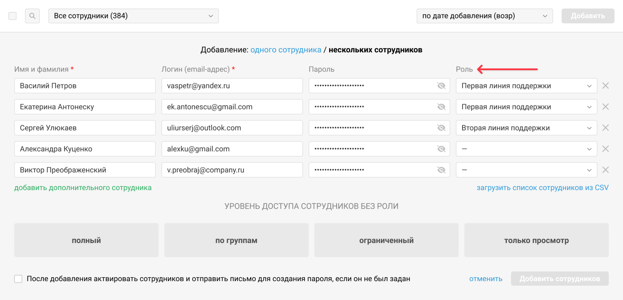 4. При массовом создании сотрудников можно сразу задать нужные роли каждому из них.