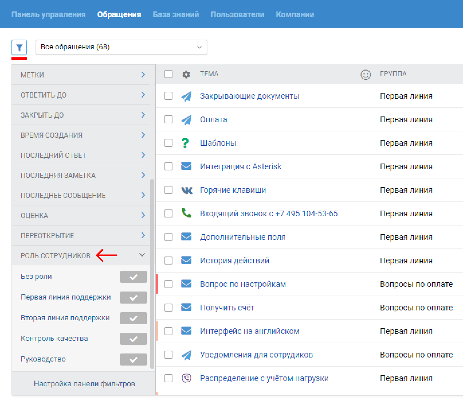 Как посмотреть обращения сотрудников с определенной ролью