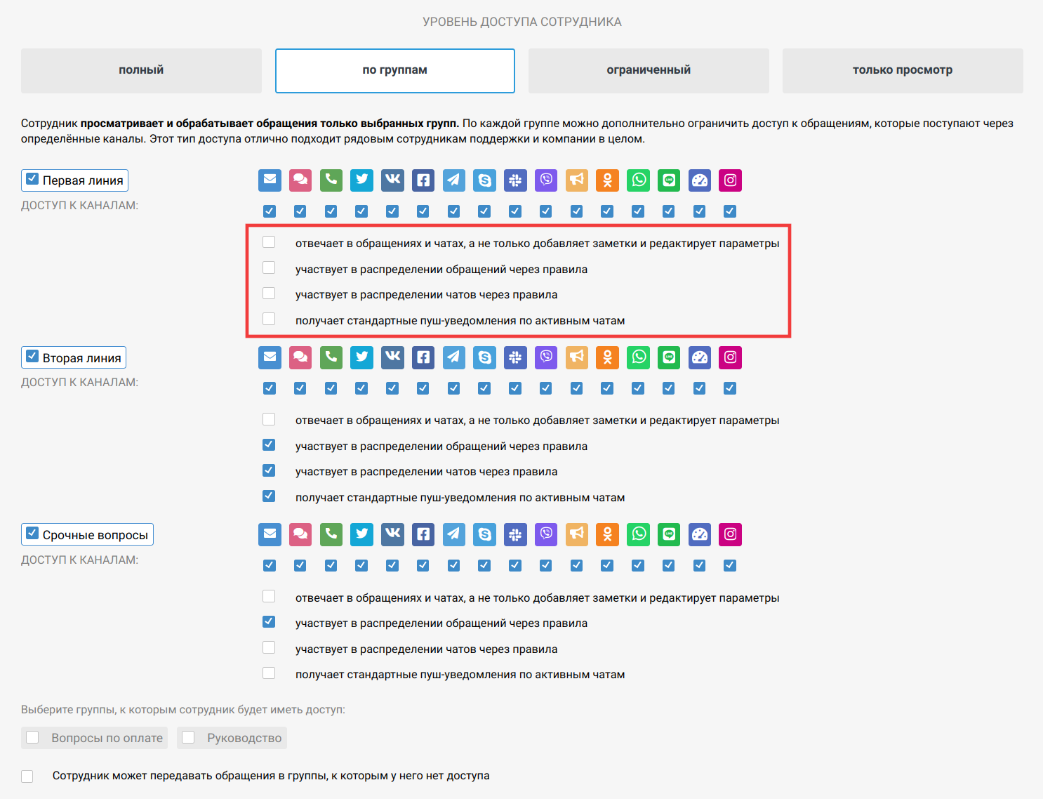 Доступ по группам дает сотруднику возможность видеть все обращения в разрешенных группах. Подходит для большинства сотрудников службы поддержки.
