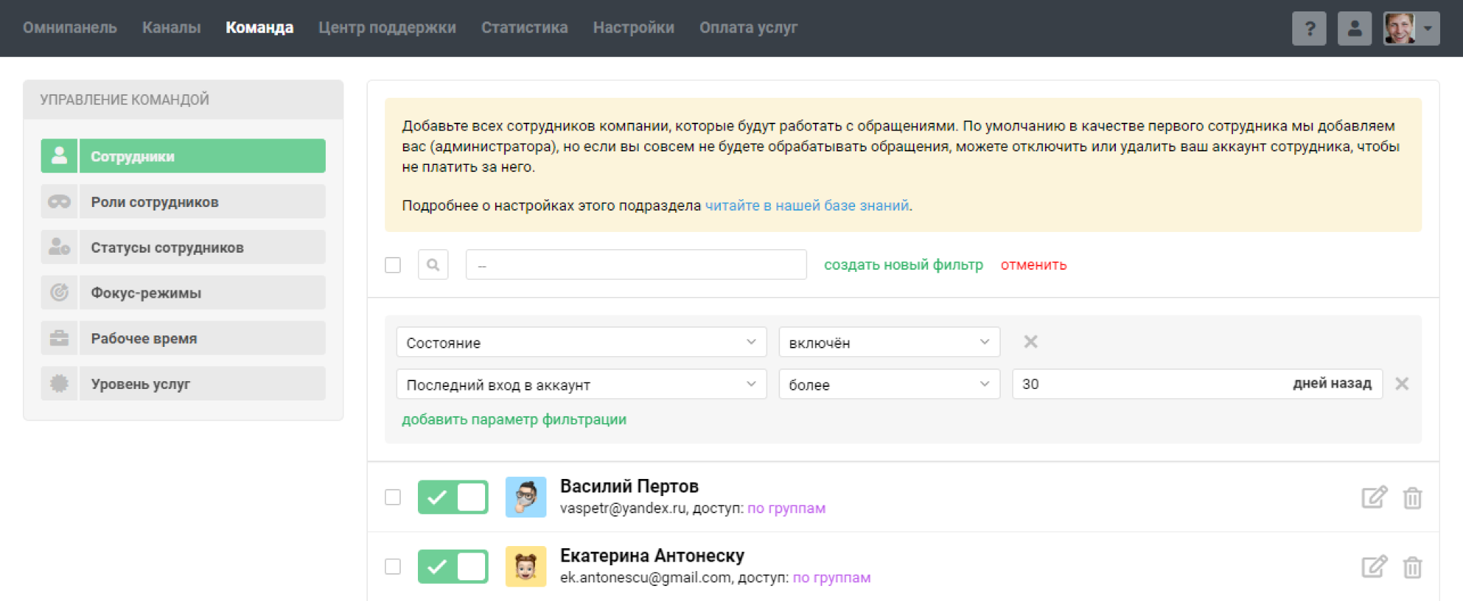 PRO подсказка: Фильтр по последнему входу поможет легко найти сотрудников, которые давно не входили в свои аккаунты. Например, если сотрудник не был в Омнидеске больше месяца, возможно, ему в принципе не нужен аккаунт в системе, и стоит его отключить/удалить, чтобы не тратить лишние деньги.