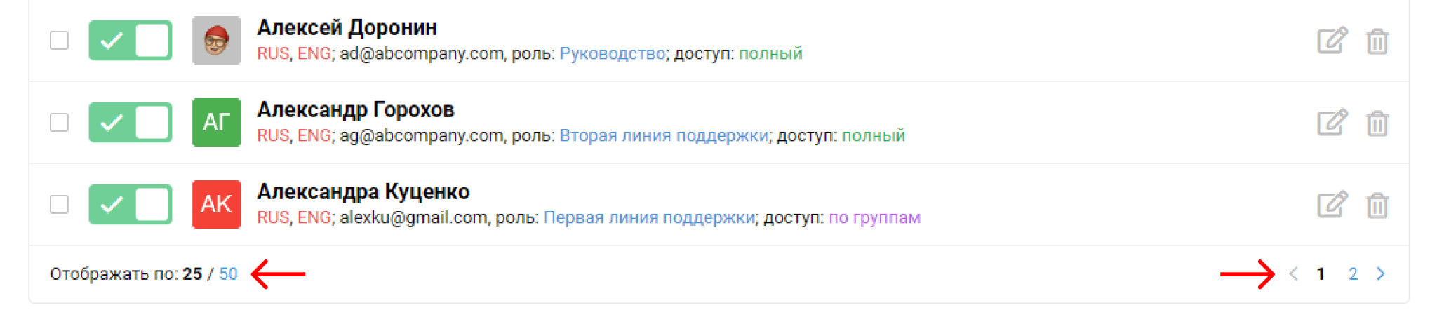 У списка сотрудников есть постраничная навигация. Вы можете выбрать количество сотрудников, отображающихся на одной странице, — 25 или 50.