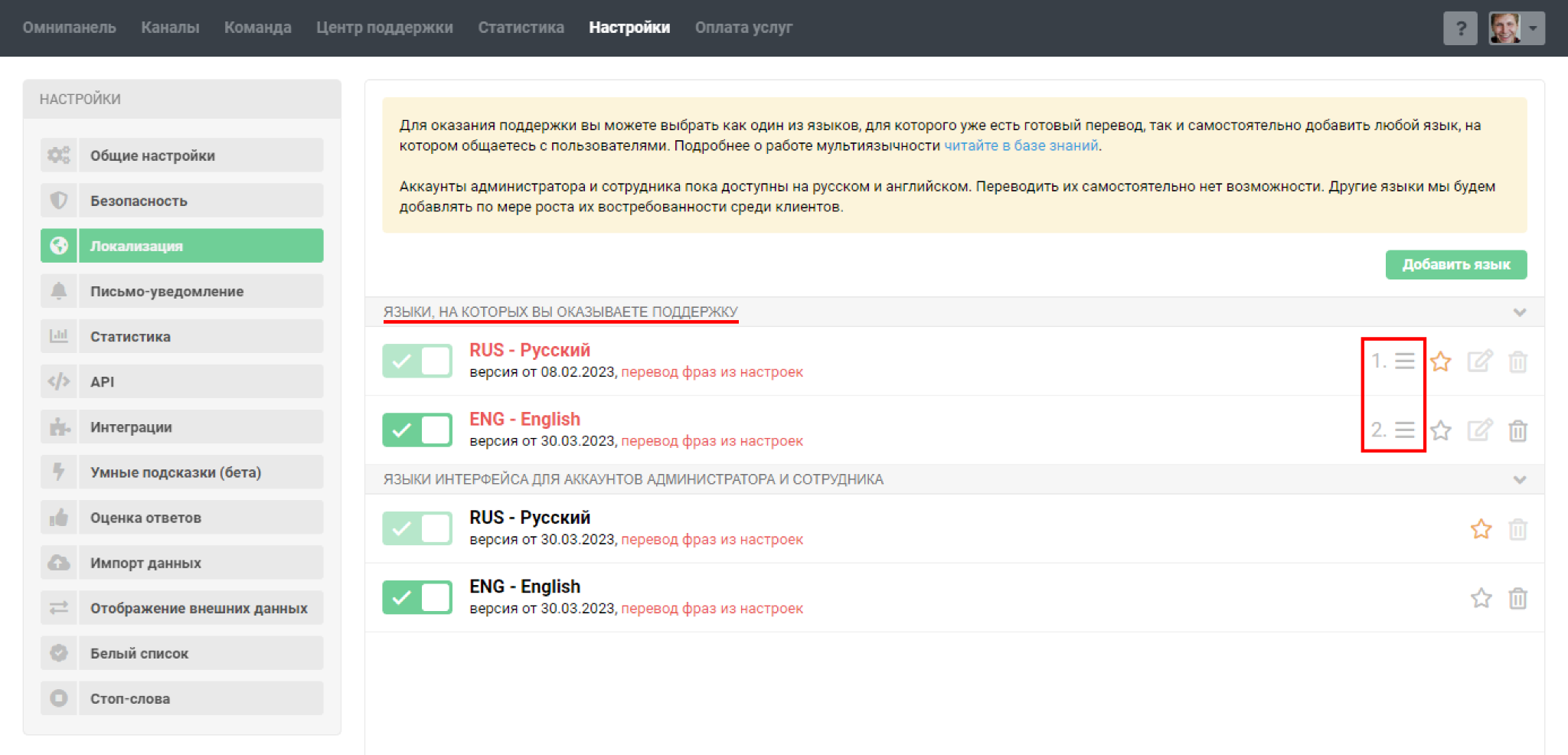 По умолчанию в качестве первого сотрудника мы добавляем администратора. Если администратор будет заниматься исключительно настройками и доступ к обращениям ему не нужен, можете удалить этот аккаунт сотрудника.