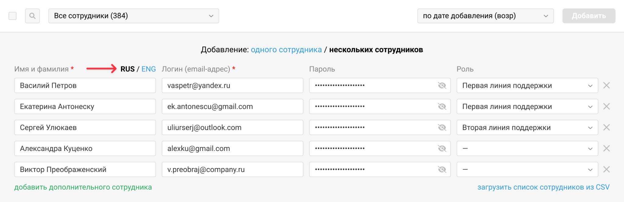Создавать новых сотрудников можно не только вручную, но и импортом данных из файла формата CSV, в котором можно указать имя, email-адрес, пароль и роль.
