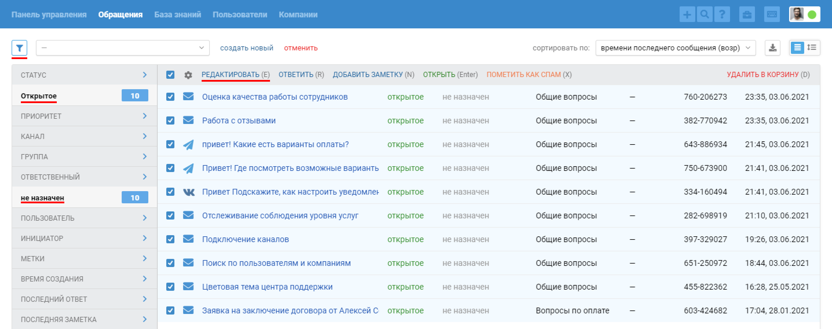 Чтобы быстро найти такие обращения, выберите соответствующие фильтры в общем списке обращений и через массовые действия смените в них статус или выставьте кого-то из сотрудников ответственным.