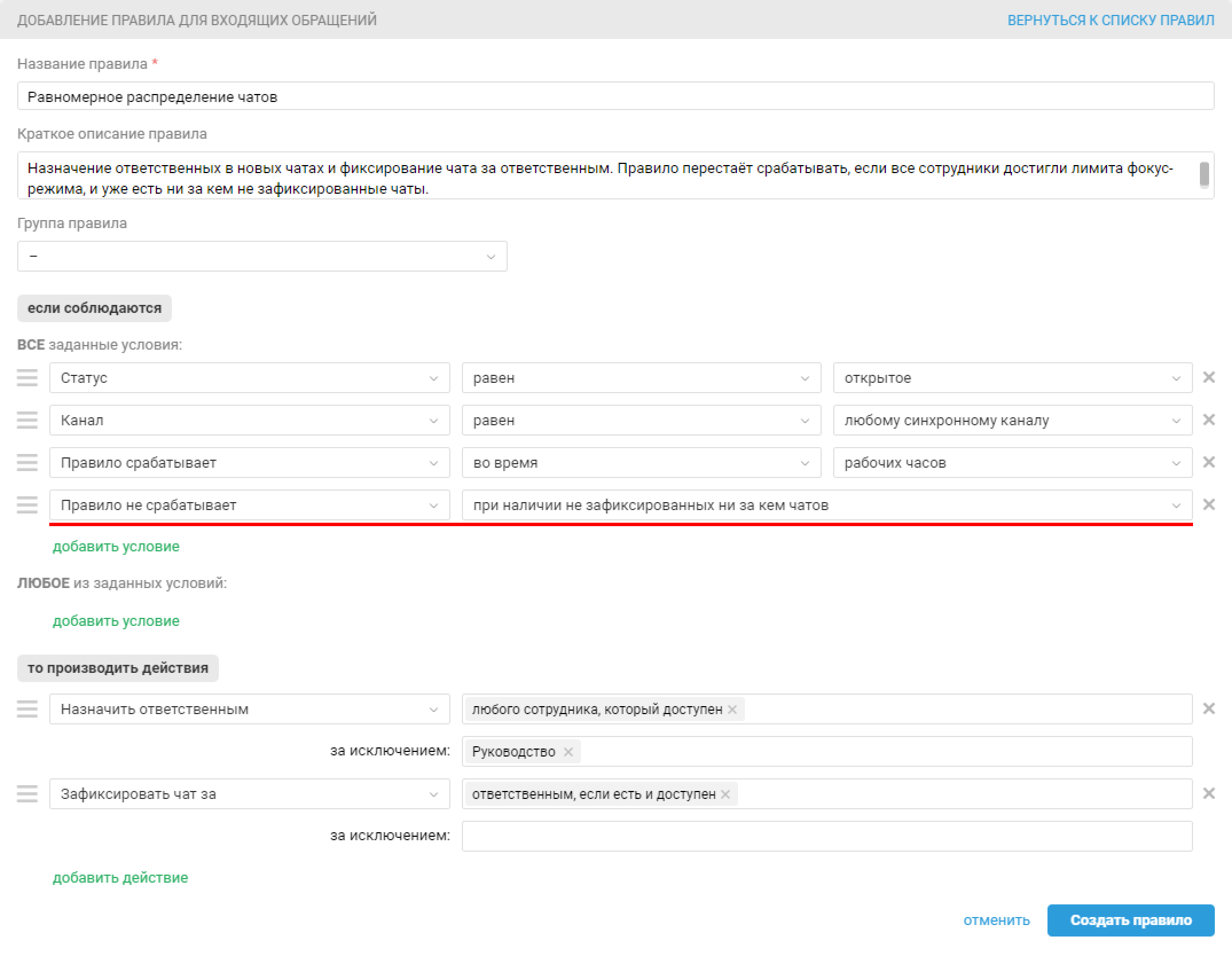б) В правилах для распределения чатов (обращения по сообщениям из соцсетей, мессенджеров, кастомных синхронных каналов) в блоке «Все заданные условия» нужно добавить условие «Правило не срабатывает — при наличии не зафиксированных ни за кем чатов».