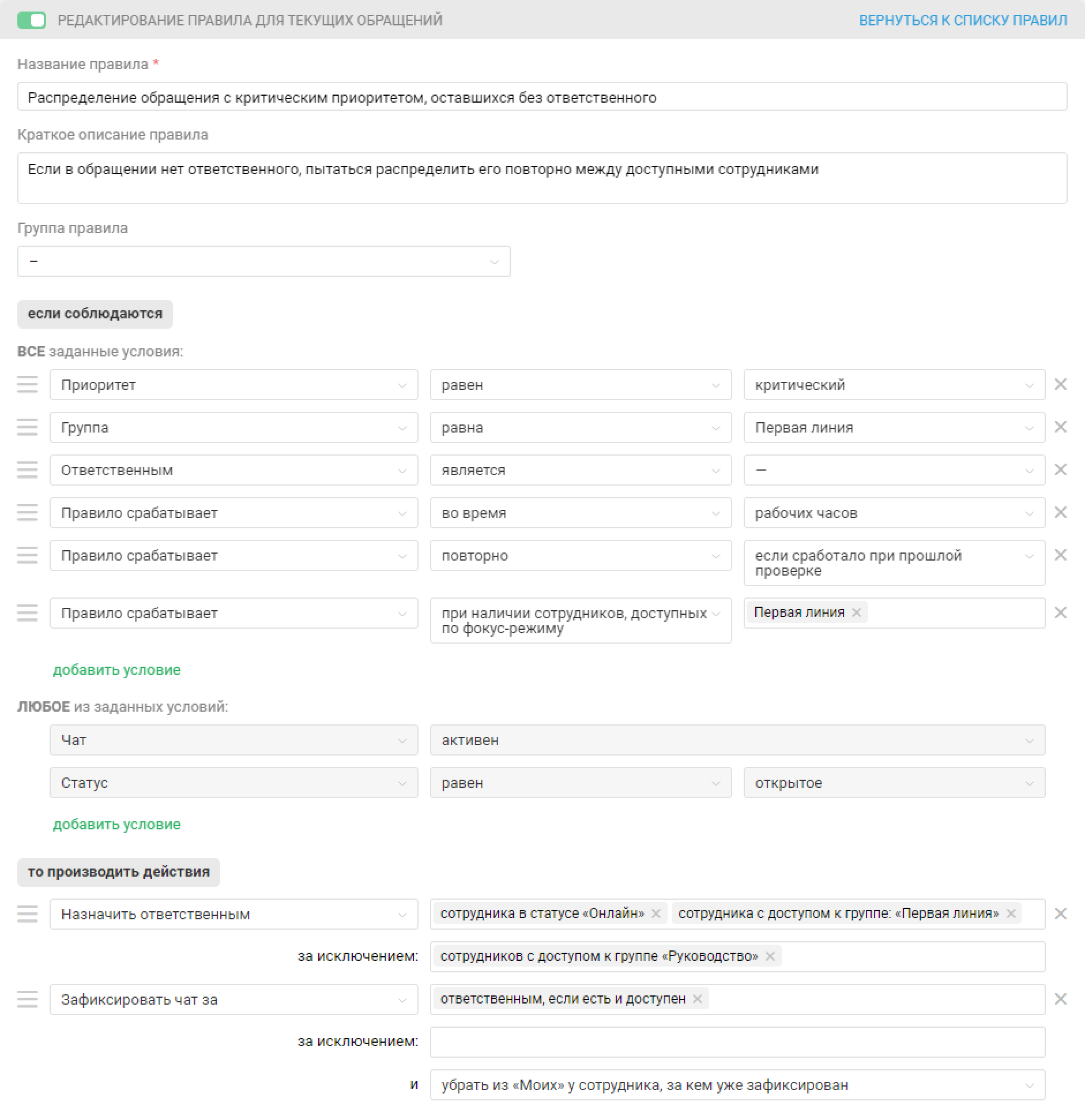 Перед добавлением этого условия в правила убедитесь, что у вас нет каких-то старых или тестовых обращений в статусе «открытое», в которых нет ответственного, потому что иначе новые обращения перестанут распределяться.